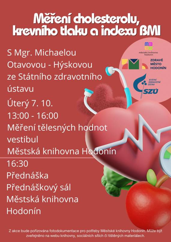 Ve vestibulu Městské knihovny Hodonín proběhne od 13:00 do 16:30 měření cholesterolu, krevního tlaku a BMI. Od 16:30 následuje přednáška Mgr. Michaely Otavové - Hýskové na téma zdravého životního stylu, výživy a pohybu v přednáškovém sále.