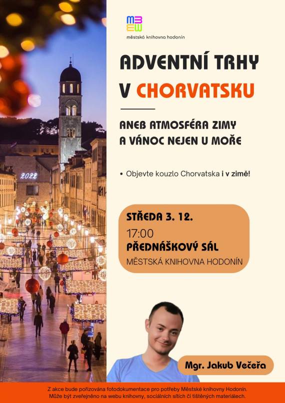 Přestože u turistů jsou v období adventu ještě stále oblíbenější bližší destinace, v poslední době zjišťují, že Chorvatsko stojí za to objevovat i v jiných ročních obdobích – advent nevyjímaje. V rámci virtuální cesty po Chorvatsku navštívíte záhřebské vánoční trhy, které byly třikrát za sebou vyhlášené jako nejhezčí v celé Evropě. Přednáší kroatista Mgr. Jakub Večeřa.
