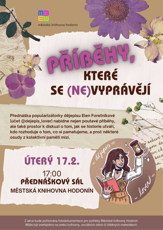 Přijďte si poslechnout vyprávění o pozoruhodných osobnostech a událostech českých i světových dějin, na které se často zapomíná, přestože mají co říct i dnešku. Přednáška popularizátorky dějepisu Elen Foretníkové (účet @dejepis_lover) nabídne nejen poutavé příběhy, ale také prostor k diskuzi o tom, jak se historie utváří, kdo rozhoduje o tom, co si pamatujeme, a proč některé osudy z kolektivní paměti mizí.